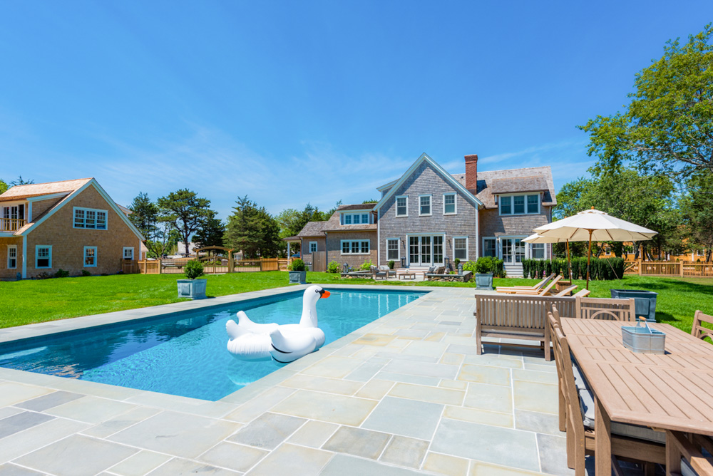 Located half a mile from Edgartown Village Center and two miles from State Beach is this lavish property. This large vacation home and guest house offers the perfect package for a summer vacation in Martha's Vineyard. The stylish main house hosts a living room well-lit with natural light, a relaxing screened porch, and a spacious family dining and kitchen area. At the guest house you'll fine another cozy living room as well as its own kitching and dining area. Then, between the houses is the lovely backyard complete with a sizeable private pool a comfortable outdoor furniture. It's a perfect summer retreat for groups of up to nine guests.
