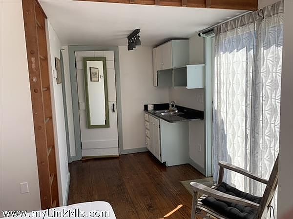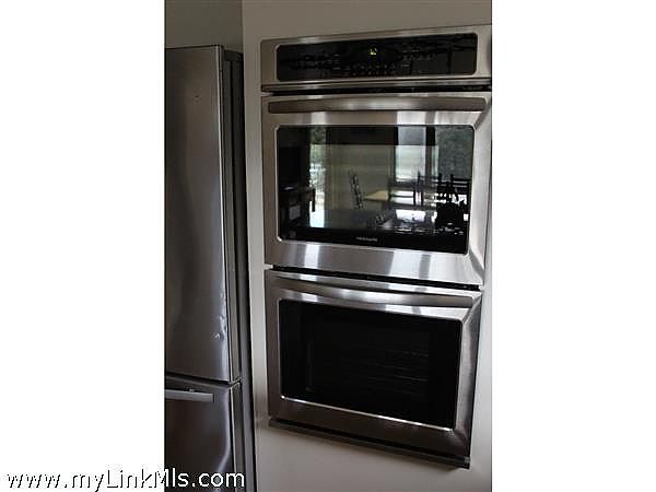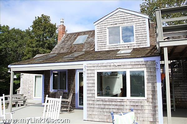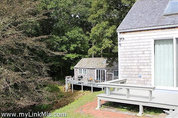 Enter Main house from the covered porch -matching custom arch doors lead you to either the mudroom/laundry room-kitchen entry, or the living room. The kitchen has Mexican tiled floor & granite counters with stainless steel appliances & gas 4 burner cooktop. & Double wall oven. Eat in Kitchen dining area with lots of natural light and 2 glass sliders to the deck and patio. The pantry hallway leads to living room (off hallway) is a full bathroom with glass block tiled shower. Open Livingroom with cathedral ceiling and wide pine floors. Slider leads to covered porch and back deck. Versatile floor plan with many options for accommodating multi-generational living, au pair suite bedroom with loft, home office or privacy for guests with their own entrance. Another large bedroom is located just off the living room. The back of the house is wrapped with a 30x20 deck, with distant water views of Vineyard Sound & Tarpolin Cove on Naushon.