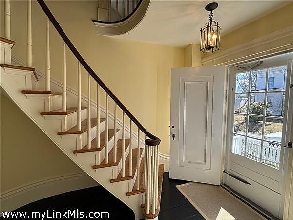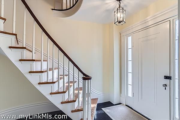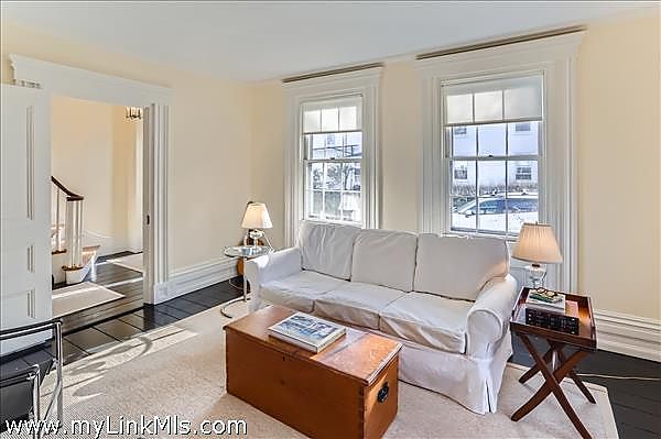 Two of the five bedrooms are on the first floor, including a private ensuite with a full bath. The home is notable for its unusually large and abundant windows, flooding the south-facing interior with natural light. The winding staircase is a sculptural centerpiece that greets you as you enter through the original front door. Renovations include a new roof over the porch, three modernized bathrooms, and updates throughout the first and second floors, all carefully designed to honor the home’s historic charm.