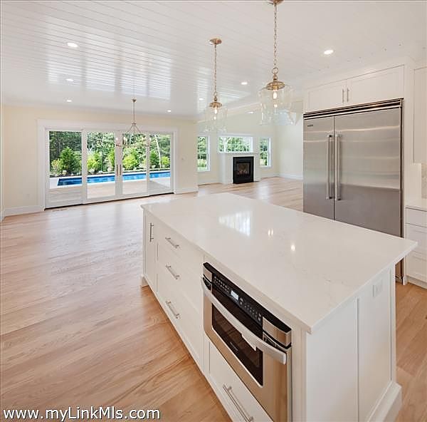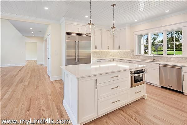 Welcome to this NEWLY CONSTRUCTED gorgeous gambrel home with a POOL that is close to SOUTH BEACH and EDGARTOWN VILLAGE! This home sits upon a flat, beautiful parcel of land with mature trees. The facade of the home presents an inviting covered porch with free standing columns, a granite entry step, mahogany decking and shiplapped ceiling. Attention to architectural detail presents at moment one. The welcoming expansive entry foyer presents your eye with an oversized lounge area to the right and a spectacular great room ahead. The great room offers a soaring cathedral ceiling and a rear wall of two story windows with a gas fireplace that is wrapped with a shiplap surround, very stunning! The great room opens to the dining room which features a wall of sliding glass doors overlooking the outdoor entertaining and pool area. The dining room flows into the large gourmet kitchen which features a kitchen island that can seat four. From the dining and kitchen area there is easy access to the smartly designed mudroom which offers a half bath, large pantry, and laundry area. Off the mudroom area is a large outdoor shower with quick access to the heated saltwater pool. The plot offers five bedrooms, four of which are being built. The first floor hosts the primary bedroom with a luxurious bathroom featuring a soaking tub, oversized tile and glass shower, a two sink vanity and a private toilet area. Three custom built closets are found in this primary bedroom en-suite offering plenty of storage, a closet for linens, a closet for accessories and an oversized walk-in closet. The second floor offers three guest rooms and two large luxurious bathrooms, one with a soaking tub, both with glamorous showers. The exterior of the home, with its mature trees, cobblestone and pea stone driveway show off the homes architecture and is framed by its landscape. In the rear yard you experience privacy in the 14 x 30 ft. salt water heated pool that is surrounded by bluestone and professional landscaping. From the dining area, the mudroom and first floor primary bedroom you can access the rear yard onto a custom built deck, all overlooking the private pool area. A very wise and welcoming design! The plot can support a future garage and guest house. The home is currently under construction, to be completed by March 1st of 2026. Photo’s are of a similar home that was built.