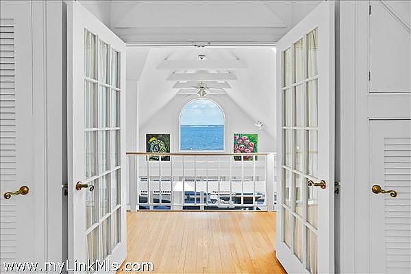 The first floor hosts two inviting bedrooms and a stylish full bathroom complete with tub/shower and a convenient laundry area. An open staircase ascends to a second-floor balcony, leading to a stunning primary bedroom suite. Here, French doors open to reveal a sanctuary with vaulted ceilings, a luxurious full bath with another glass walk-in shower, and, of course, those mesmerizing water views.