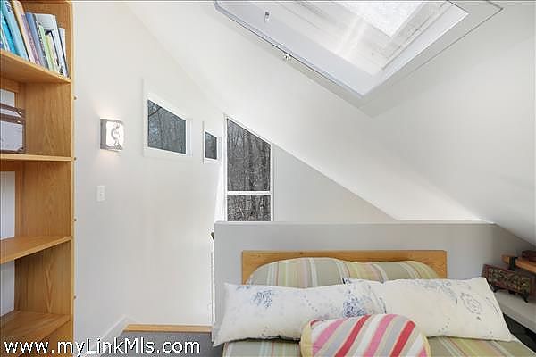 Perched atop Fulling Mill Hill this distinctive contemporary main house plus guest house offers mid-century charm and a serene retreat set on 3.3 acres of mature oak and beech forest and bordered by an ancient stone wall. Designed by renowned Yale School of Architecture Dean Paul Mitarachi, the main house features a striking circular entryway framed by mature Asiatic gardens. Step inside to discover a custom circular staircase with dramatic floor to ceiling windows, leading to the upper living area flooded with natural light from the wall of south-facing windows. The living area with high ceilings and woodstove is a comfortable place to congregate, while the kitchen and open dining areas lend themselves to modern day living. Glass sliding doors open onto a spacious 2nd story deck giving the entire living space an intimate relationship with the outdoors. On the first floor there are three total bedrooms; two bedrooms sharing a full bath plus a primary bedroom with a full bath en-suite.