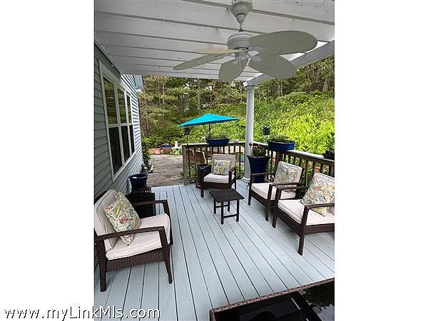 Step outside to a beautifully designed exterior living space featuring an expanded bluestone patio and deck—ideal for dining, lounging, or entertaining. The deck is outfitted with a custom removable canvas shade by MV Sails, offering comfort and protection from the sun. A teak table, chairs, and umbrella (included in sale) make the space turnkey and ready to enjoy. Perennial flowers line the hill behind the home, enhancing the serene atmosphere (irrigation throughout).