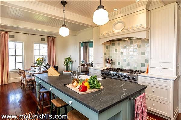 As you step inside, you'll be greeted by the warmth of four wood-burning fireplaces, handsome hardwood and painted floors, custom millwork and built-ins, a spacious screened porch and more! The rooftop widow's walk provides breathtaking 360-degree views, while the sparkling blue waters of Katama Bay can be seen and enjoyed from most every room in the house