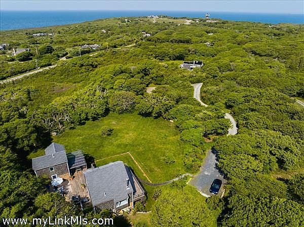This unique hilltop property is located at the end of a private drive, surrounded by the natural beauty of Aquinnah. It consists of two separate contemporary "Acorn houses," creating airy, light-filled environments and offers views over the expansive, meadow-like lawn that extends toward the ocean. From this vantage point, you can enjoy breathtaking views of the Atlantic Ocean, the Elizabeth Islands, a glimpse of the North Shore, and the Gay Head Lighthouse.