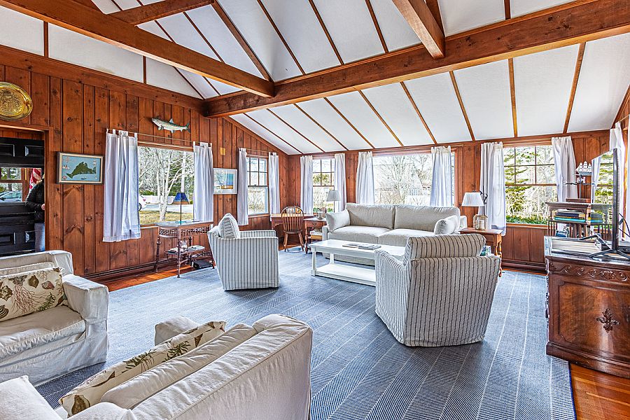 The large family room with abundant light and a vaulted ceiling has multiple seating areas with a TV. The cozy dining area is open and adjacent to the well-equipped kitchen. Glass sliders open to the dining deck.