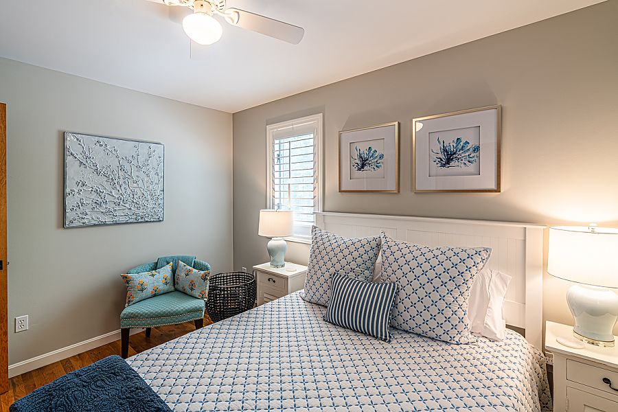 Bedroom 2: 1st Level, Queen, ceiling fan, A/C, shares hall bath