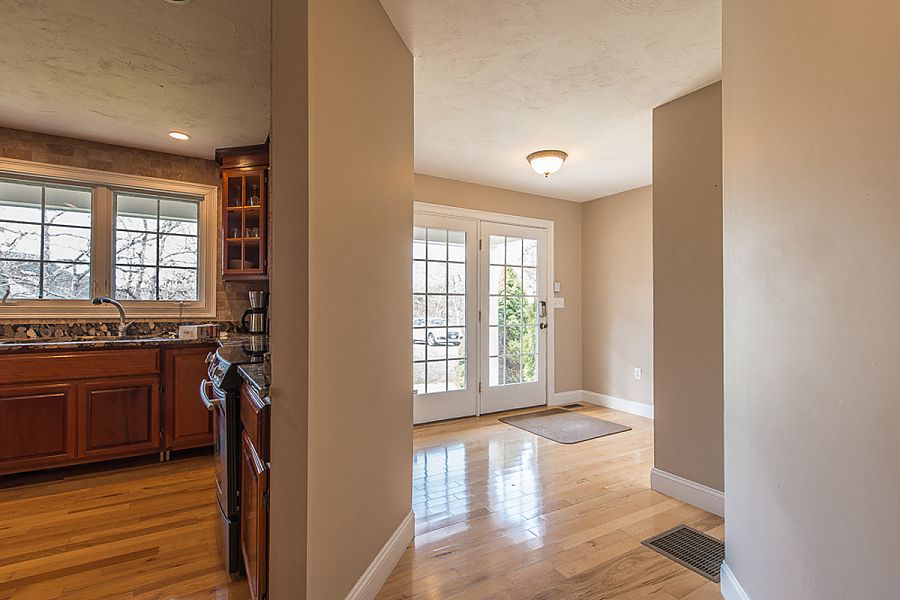 The kitchen and dining areas are also open to the main living area creating a great connected gathering space for families.  The gourmet kitchen features granite counter, stainless appliances and is well outfitted for family meals. The adjacent dining area hosts a large dining table that seats 8. The first level is completed by a half bath and laundry area.