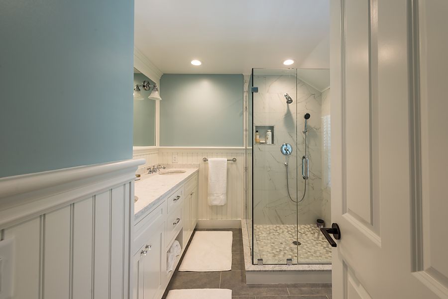 One of two primary bedrooms has a spa-like bath with a walk-in glass shower, soaking tub, and dual vanities and is located on the first level.  French doors open to a private side deck with outside shower room.